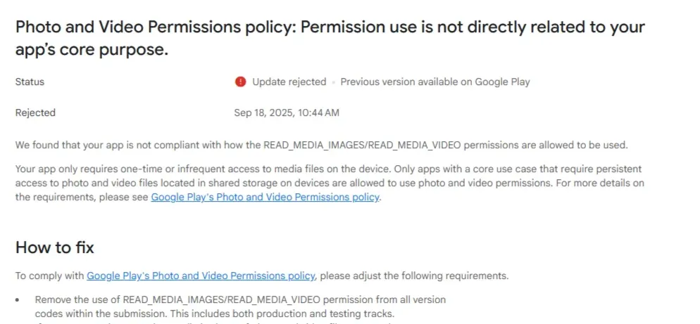 Crashes are one of the fastest ways to fail store review. Even if the issue only occurs on a subset of devices, platforms like Google Play can detect it through automated testing and flag the release before it reaches users.