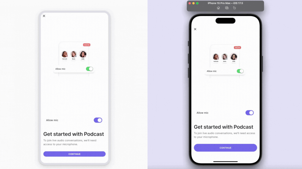 In the example below, we test microphone permissions in two environments: one running in DreamFlow’s web preview, and the other running in the iPhone 15 Pro Max simulator.